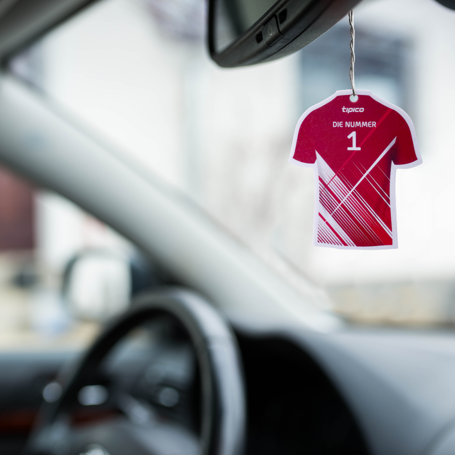 Das Trikot mit Tipico Logo bringt nicht nur einen frischen und angenehmen Geruch ins Auto, er befindet sich auch im Sichtfeld des Fahrers oder Beifahrers und ist auch von außen gut sichtbar. Somit wird die Marke Tipico stetig ins Gedächtnis gerufen.