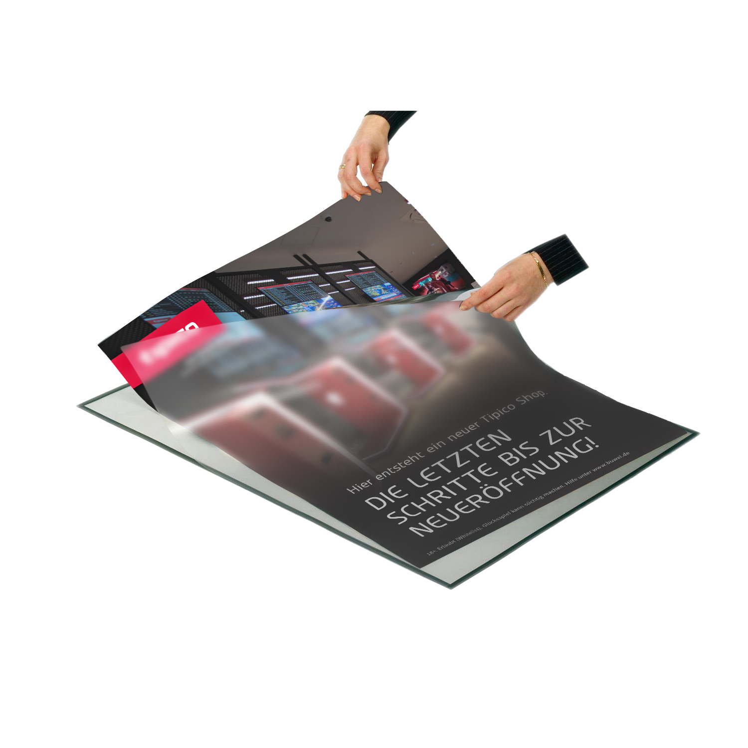 Die Antireflex- und wasserfeste PET Folientasche eignet sich für den Kundenstopper im Format DIN A1. Sie besteht aus zwei Schutzfolien mit umlaufender Dichtung / Randpolsterung.