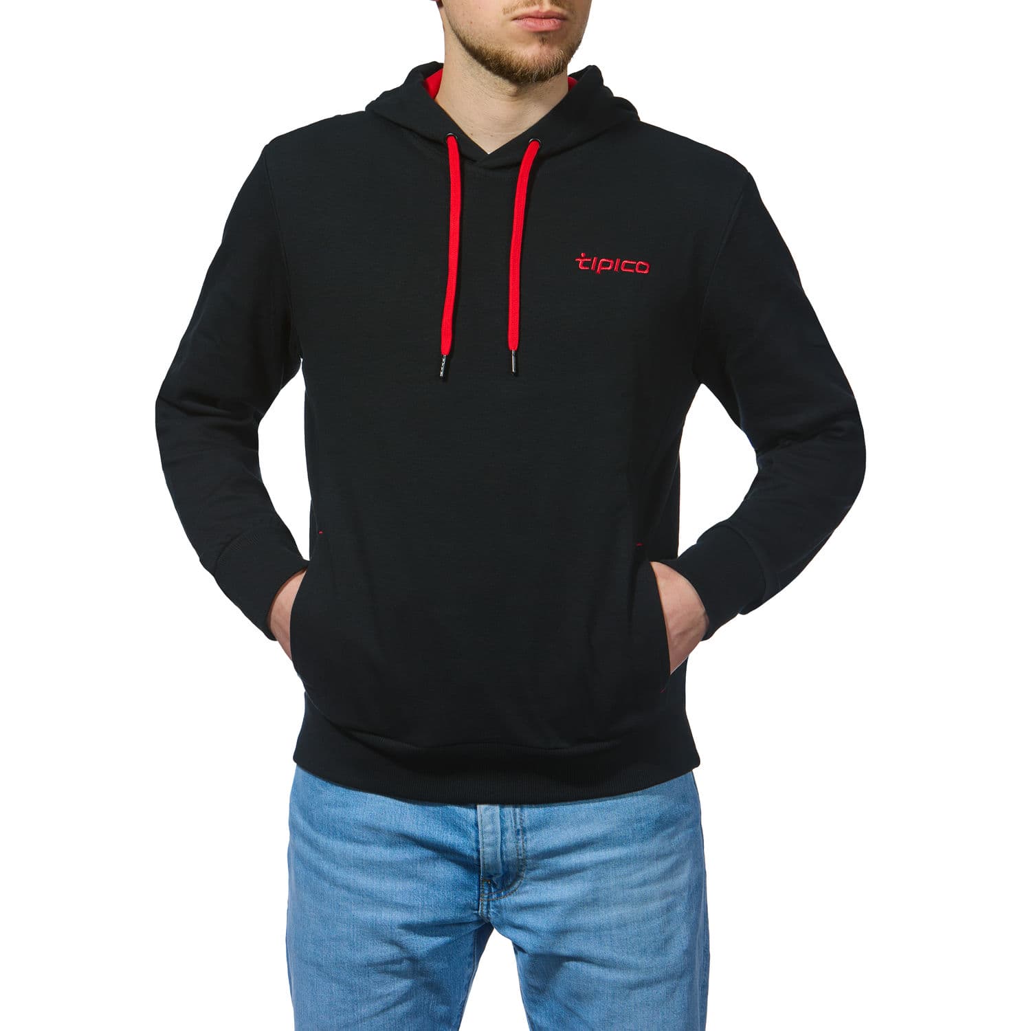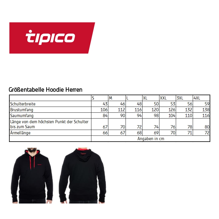 Herren Hoodie mit Kapuze. Der Hoodie verfügt über ein eingesticktes Tipico Logo an der Kapuzenaußenseite sowie über eines auf der linken Brust. Die praktischen Einschubtaschen an beiden Seiten, gerippte Bündchen und der rote Kordelzug vervollständigen den Look. Zusätzliches Highlight ist die farblich hinterlegte Kapuzeninnenseite.