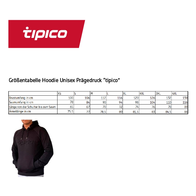 Das Tipico Logo befindet sich als Prägung auf der Vorderseite und findet sich auf der Kapuze als High Density Druck wieder. Der Hoodie verfügt außerdem über eine Kängurutasche und die Kapuze hat einen Kordelzug.