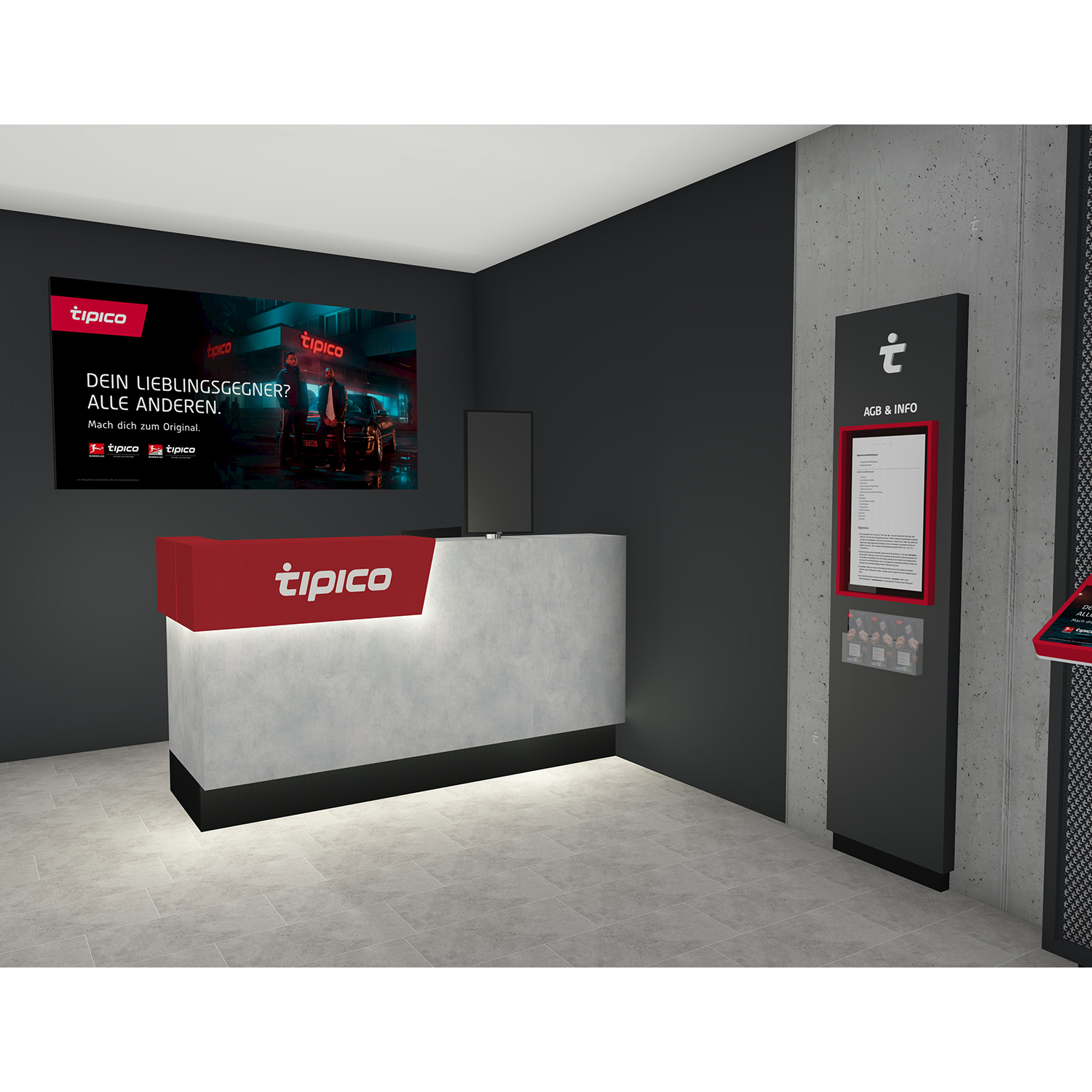 Der Korpus des Tipico AGB & Info Counters besteht aus einem robusten und in Tipicofarbe beschichtetem Holz sowie einem rot umrahmten 27“ Touch Display. Der Tipico AGB & Info Counter ist mit einem „t-Logo“, drei Prospekthaltern und dem Schriftzug AGB & Info aus weißem Acryl ausgestattet. Dieser macht alle für Ihren Shop relevanten Themen an einem Punkt digital zugänglich Durch die regelmäßigen Softwareupdates werden die Informationen immer auf dem aktuellsten Stand gehalten werden. Der AGB und Info Counter kann ebenso hervorragend in das bestehende Shopkonzept 1.0 integriert werden.