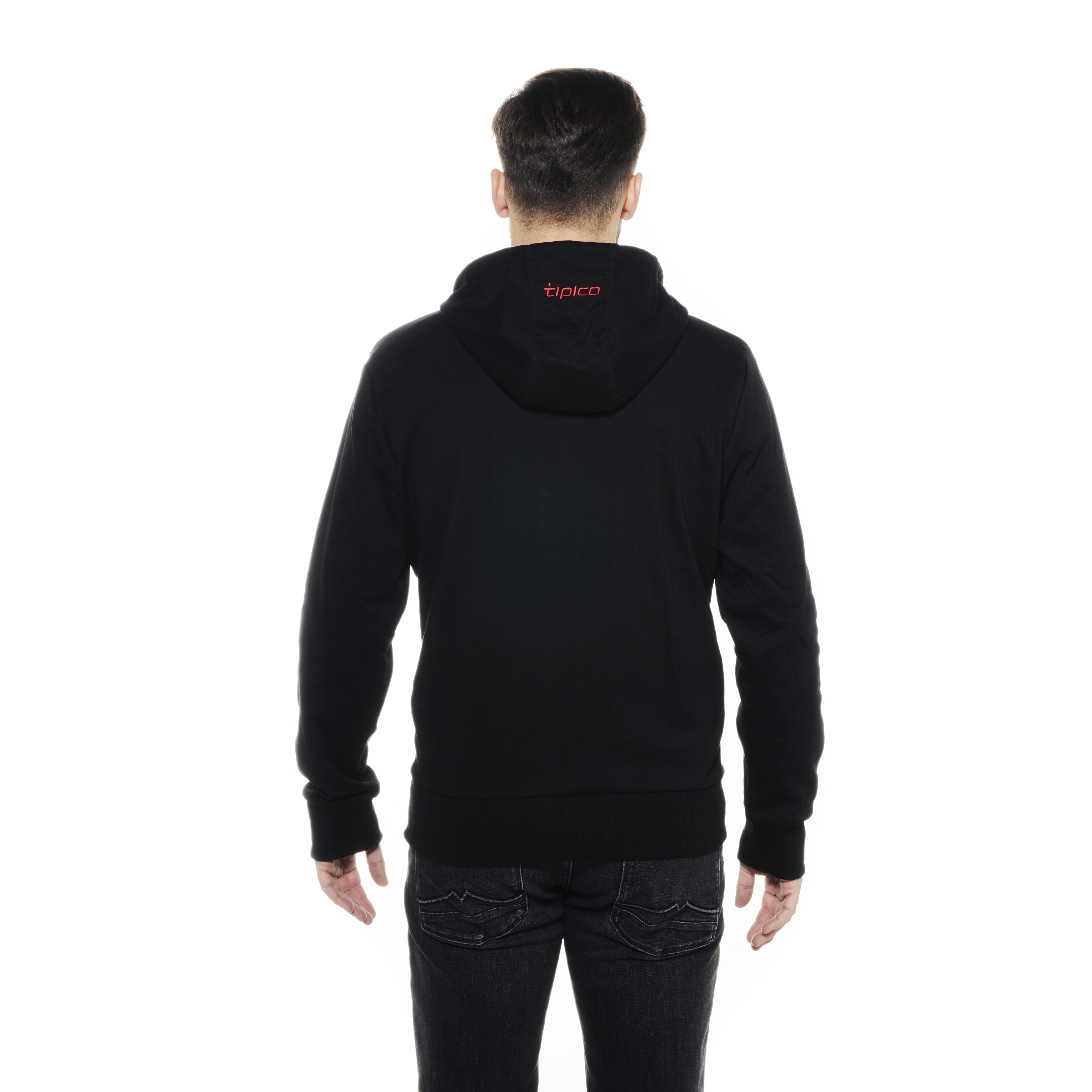 Die Zip Jacke mit Kapuze ist aus hochwertigem Interlock-Material gefertigt. Durch den hohen Baumwollanteil weist die Zip Jacke einen hohen Tragekomfort auf und ist atmungsaktiv. Die Jacke verfügt über eine Kapuze mit Kontrastfutter in der Farbe rot, praktische Seitentaschen mit Reißverschluss und gebrandete Zipperpuller. Auf der linken Brust findet sich ein Tipico Schriftzug, welcher zusätzlich auf die Kapuze gestickt wurde. Rote Kordeln und gerippte Bündchen runden das ansprechende Design ab.