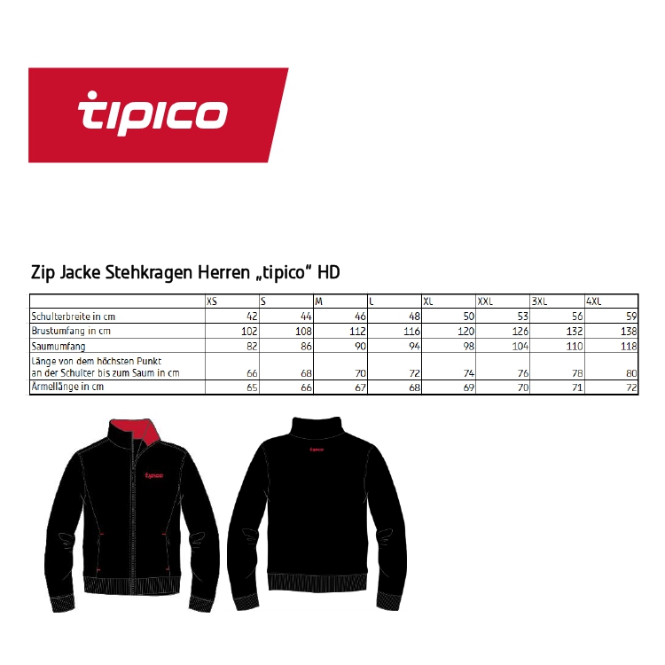 Die Zip Jacke mit Stehkragen besteht aus 60% Baumwolle und 40% Polyester. Sie verfügt außerdem über ein High Density Tipico Logo auf der linken Brustseite und am Nacken. Die praktischen Seitentaschen, mit Reißverschluss an beiden Seiten, vervollständigen den Look. Ein zusätzliches Highlight ist die farblich hinterlegte Innenseite des Stehkragens. Bitte beachten Sie die Maßtabelle zur Auswahl der richtigen Größe.